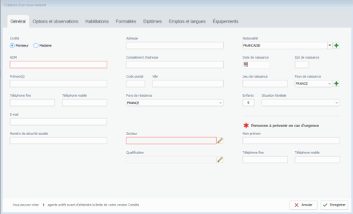 Ces informations permettront de le faire apparaître dans les listes d’agents pouvant être affectés à un profil de prestation.