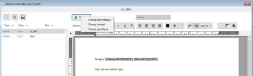{Nom de l'agent}. - Champs manuels : Ces champs permettent de définir une zone de texte dans la lettre qui sera à remplir avant chaque utilisation. Créer un champ en lui donnant un nom, puis double-cliquez dessus pour l’insérer dans votre lettre.