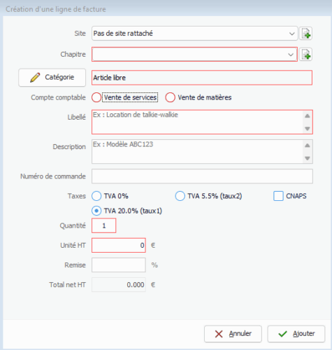 - Renseignez la quantité, le prix unitaire HT et une éventuelle remise. Le total net est calculé automatiquement.