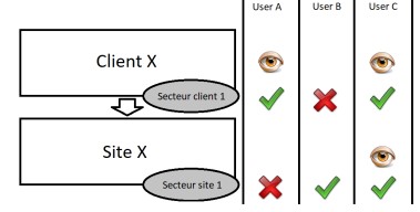 Même si un utilisateur a accès à un secteur site, il ne pourra pas voir un site de ce secteur, s’il n’a pas également accès au secteur client du client associé à ce site.