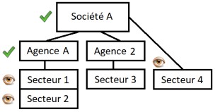 Ces liens permettent d’organiser et de restreindre les accès des utilisateurs en fonction de leur périmètre d’intervention (société, agence, secteur) :