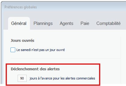 Puis, régler l’alerte sur un nombre de jours en allant sur : Plateforme > Paramètres > Préférences globales > Onglet "Généraux".
