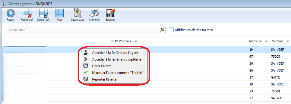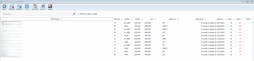 👉 Un double-clic gauche sur un type d’alerte (ex. Diplôme, revalorisation, ect…) ouvre la liste des agents ou clients concernés.