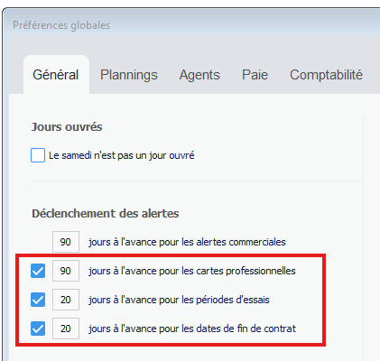 Vous pouvez paramétrer un nombre de jours pour déclencher les alertes concernant les fins de contrats, fin de période d’essai, carte professionnelles :