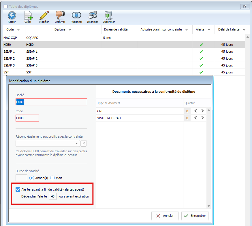 Cocher l’option « Alerter avant la fin de validité (alertes agent) », en renseignant un nombre de jours avant l’expiration. Ce déclenchement d’alerte est également possible dans les autres tables ( équipements, formalités, habilitations,)