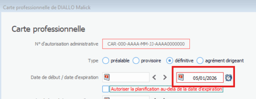 Lors de l’enregistrement de sa carte professionnelle : La date d’expiration sera prise en compte