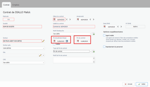 Lors de la création du contrat de l’agent : les dates de « Fin de période d’essai » et de « Fin de contrat » déclencheront des alertes.