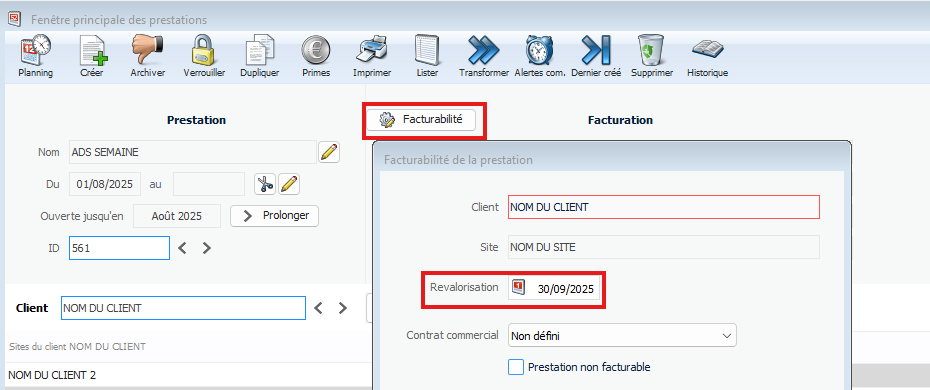 Il est également possible de définir une alerte sur les prestations depuis :Plateforme > Onglet Planification > Prestations
