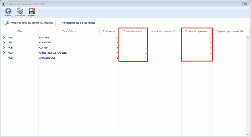 👉 Un double-clic gauche sur un type d’alerte (ex. Diplôme, revalorisation, ect…) ouvre la liste des agents ou clients concernés.