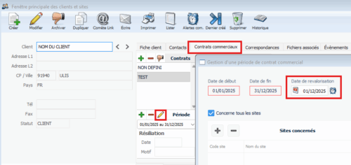 Une alerte peut être configurée sur les contrats commerciaux depuis le chemin suivant :Plateforme > Gestion Commerciale > Clients et sites > Onglet "Contrats commerciaux"