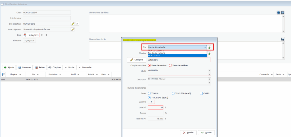La partie haute de la fenêtre permet de modifier les données de la facture.