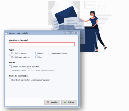 Ces formalités peuvent aussi être paramétrées pour bloquer la planification au-delà de leurs dates de fin de validité.